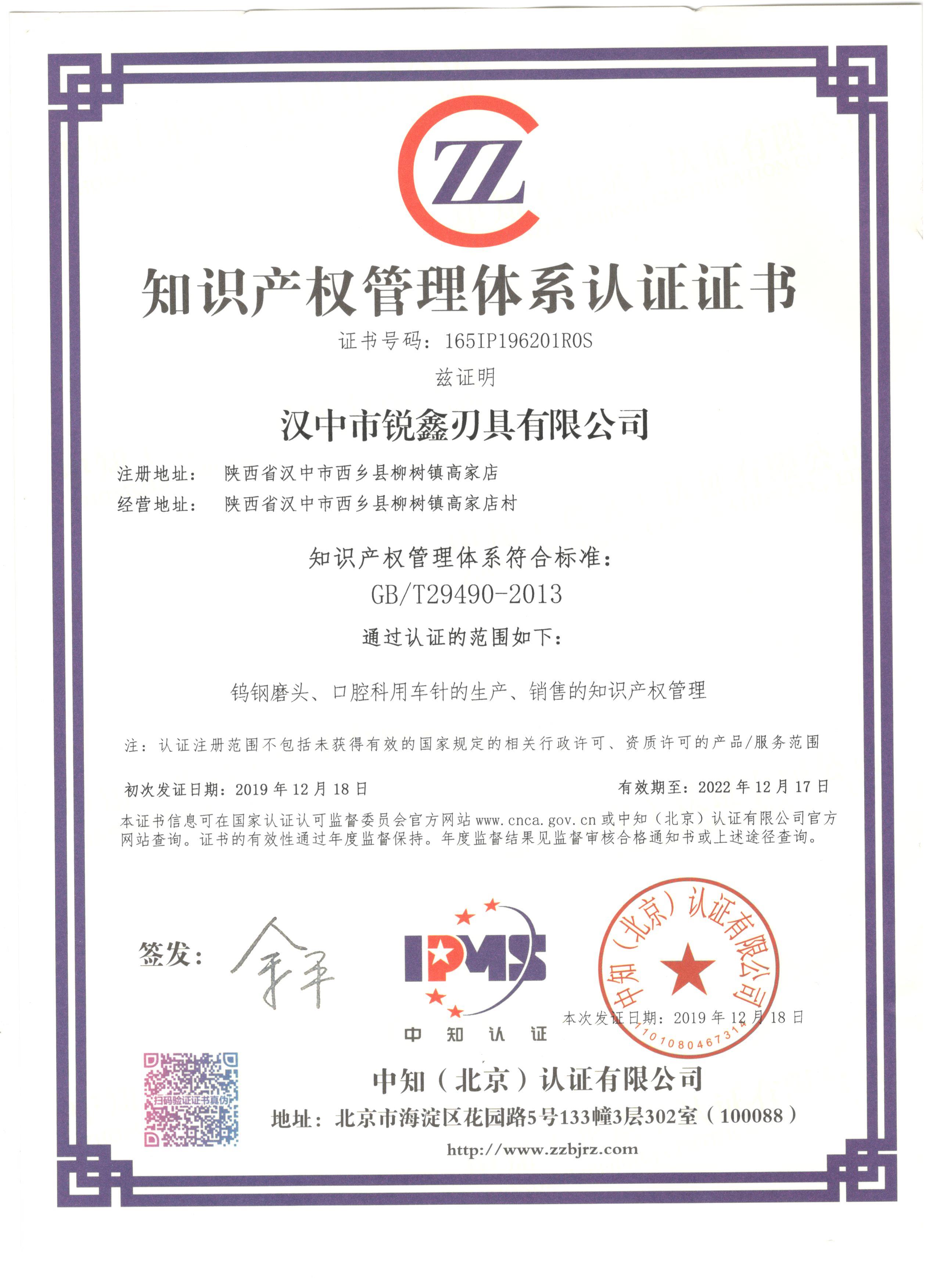 2019年12月18日,漢中市銳鑫刃具有限公司(以下簡稱:漢中銳鑫)通過了《知識產權管理規范》國家標準GB/T 29490-2013的認證,并收到了中知(北京)認證有限公司頒發的《知識產權管理體系認證》證書,這意味著漢中銳鑫在知識產權領域獲得了重要認可,并且在知識產權方面得到了進一步規范,也是企業綜合競爭力提升的體現。
